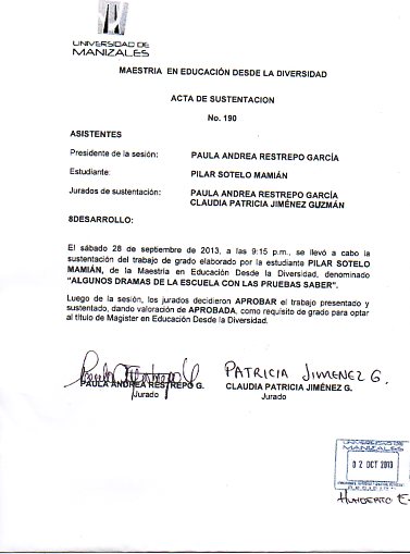 La presente investigación surge por la preocupación del bajo rendimiento en los exámenes tipo Pruebas Saber de los niños de grado quinto de la Institución Educativa Agropecuaria Nuestra Señora del Rosario, del corregimiento de El Rosal, municipio de San Sebastián y buscó comprender las causas que afectan su desempeño óptimo. Basada en la teoría fundamentada se efectuó la recolección de datos, la codificación axial y la codificación abierta, arrojando categorías y subcategorías que conllevan y explican la categoría central “Algunos dramas de la escuela con las pruebas Saber”. Los procedimientos se llevaron a cabo con la participación de estudiantes, docentes y padres de familia.