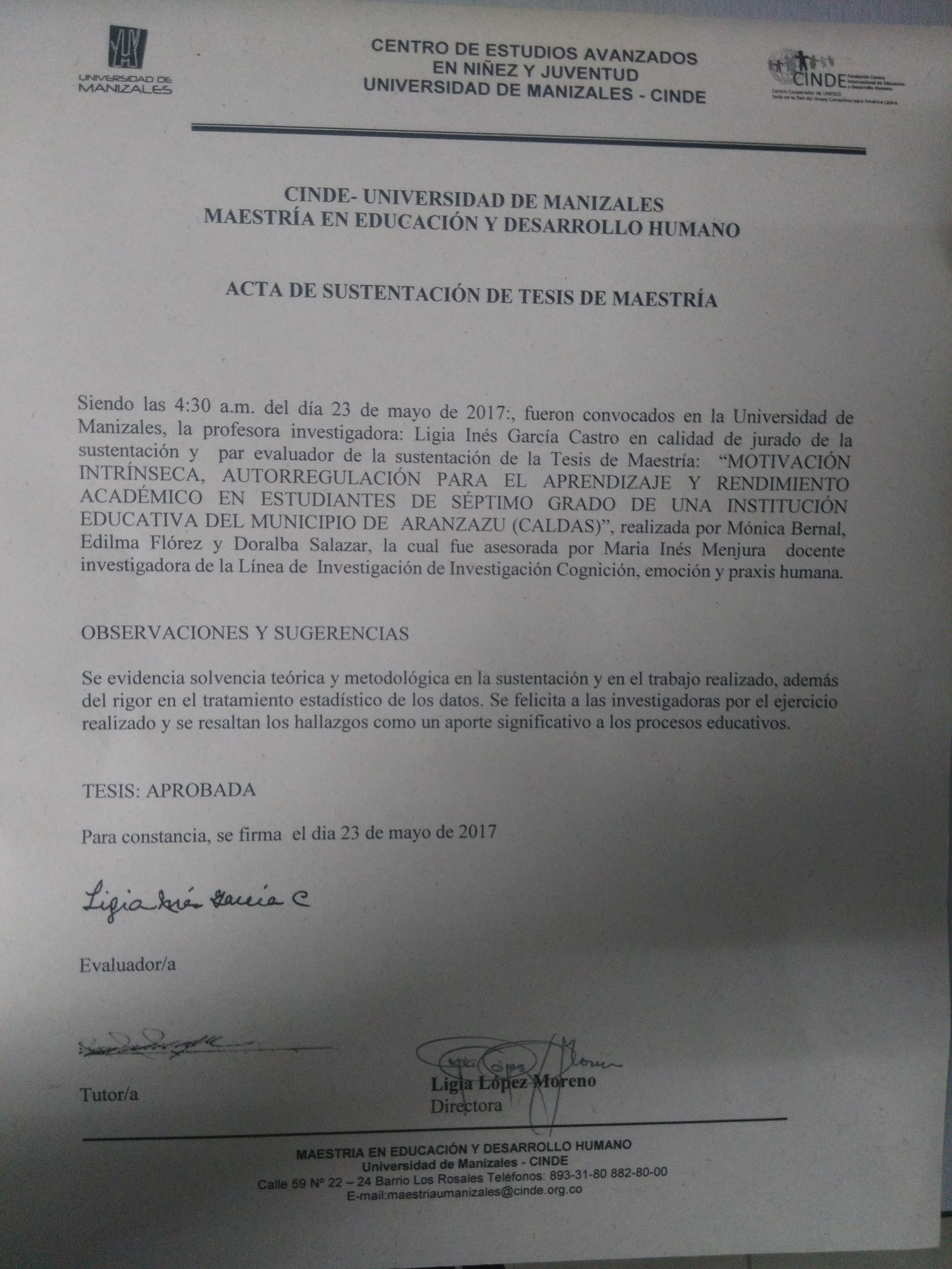 Motivación, autorregulación para el aprendizaje y rendimiento académico en estudiantes de séptimo grado de una institución educativa del municipio de Aranzazu (Caldas) adscrita al programa Ondas de Colciencias