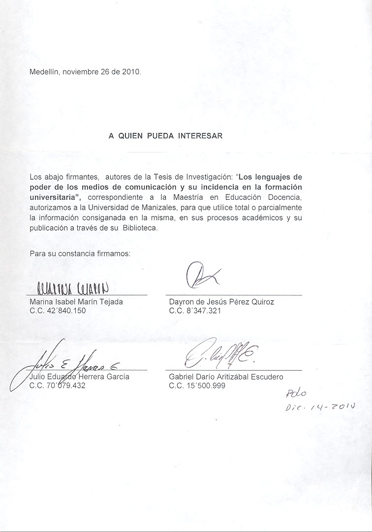 Esta investigación se desarrolló en la ciudad de Medellín con asiento en las comunidades universitarias concentradas en el Politécnico Colombiano Jaime Isaza Cadavid y en la Universidad de Antioquia y fue realizada por estudiantes de la Maestría en Educación Docencia de la Universidad de Manizales dentro del marco del marco de la investigación "Lenguajes de poder, orden y desorden en América Latina, Una mirada desde educación". La pregunta problema formulada para la investigación fue, "¿De qué manera inciden en los estudiantes universitarios los lenguajes de poder de los medios de comunicación?" y "Analizar la incidencia y la afectación en los comportamientos de los estudiantes universitarios, ejercidas por los lenguajes utilizados por los medios de comunicación, en la ciudad de Medellín," fue el objetivo general del trabajo. Los objetivos específicos fueron los siguientes: 1. "Verificar los lenguajes más utilizados por los medios de comunicación de Medellín que inciden en el comportamiento de los universitarios". 2. "Analizar los comportamientos de los estudiantes universitarios generados por los lenguajes de poder utilizados por los medios de comunicación", 3. "Entender la relación estudiantes universitarios y medios de comunicación...