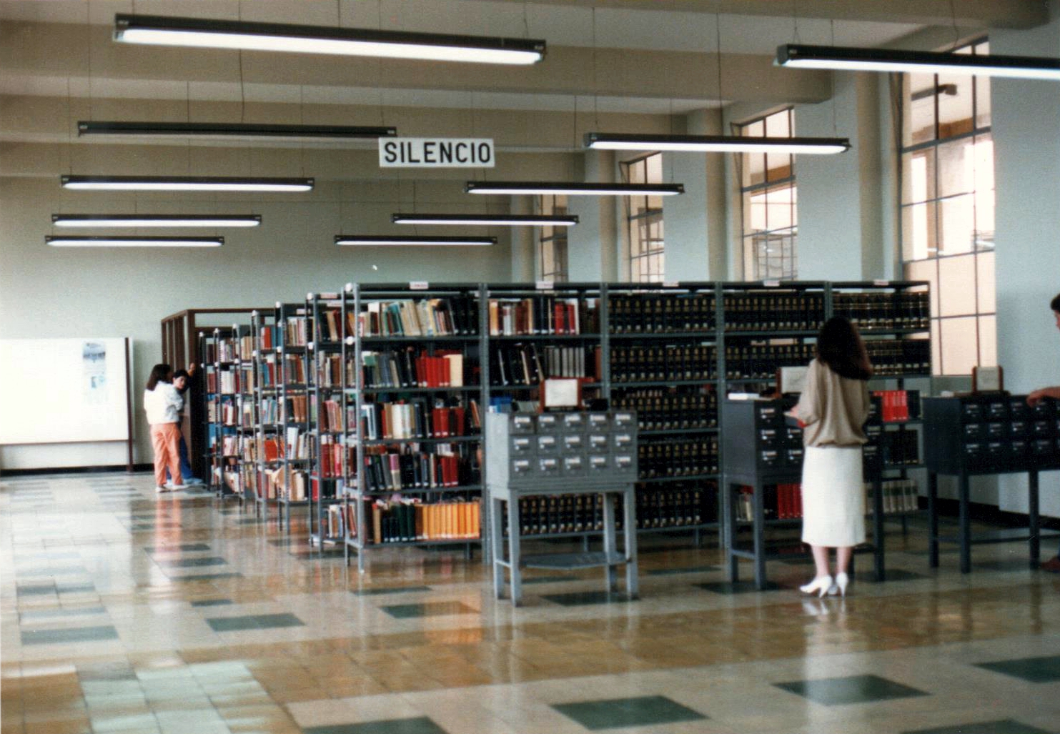 Colección bibliográfica de la biblioteca Universidad de Manizales, ubicada en el edificio histórico, año 1987, donde se encuentra actualmente el archivo y la sala de videojuegos. En la fotografía también se pueden apreciar los ficheros catalográficos, que en esta época servían para identificar los datos de los libros y su ubicación en la colección.