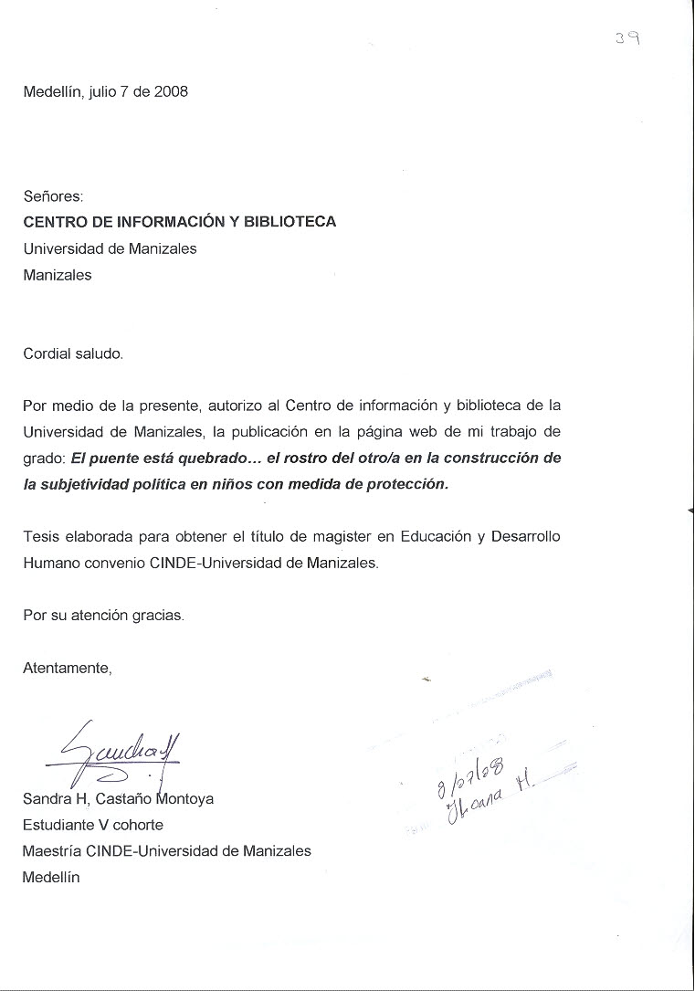 El puente está quebrado... son las voces de muchos niños/as en este país víctimas del maltrato y el abandono, encarnado en 25 niños de la Corporación Superarse de Medellín. El rostro del otro en la construcción de la subjetividad política en los niños con medida de protección desde la participación, fue una experiencia de investigación que permitió adentrarse en la vida cotidiana y en las dinámicas relacionales de cada uno de los niños de la corporación. En el encuentro laboral con la institución, surgió el deseo y la pregunta por cómo implementar prácticas de participación en los niños y jóvenes de la Corporación Superarse. Era importante, entender ¿por qué, si existe la voluntad de generar espacios de participación, a los niños les cuesta trabajo apropiarse de ellos y ejercer su ciudadanía? ¿Cómo el mundo interno de éstos niños esta atravesando de tal manera que puedan o no hacer uso de ese derecho? Esto rimitiría, necesariamente, a las condiciones internas que posee un niño para ser un sujeto que participa, en otras palabras qué recursos posee el niño para ser un sujeto político?.