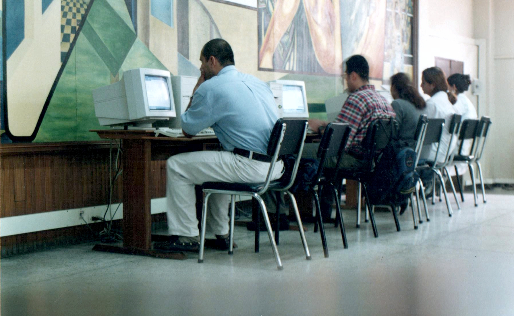 Usuarios de la biblioteca utilizando los equipos de cómputo que estaban disponibles en el año 1998.