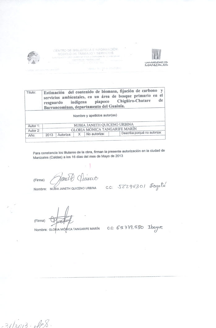Estimación del contenido de biomasa, fijación de carbono y servicios ambientales, en un área de bosque primario en el resguardo indigena Piapoco Chiguiro-Chatare de Barrancominas,departamento del Guainía