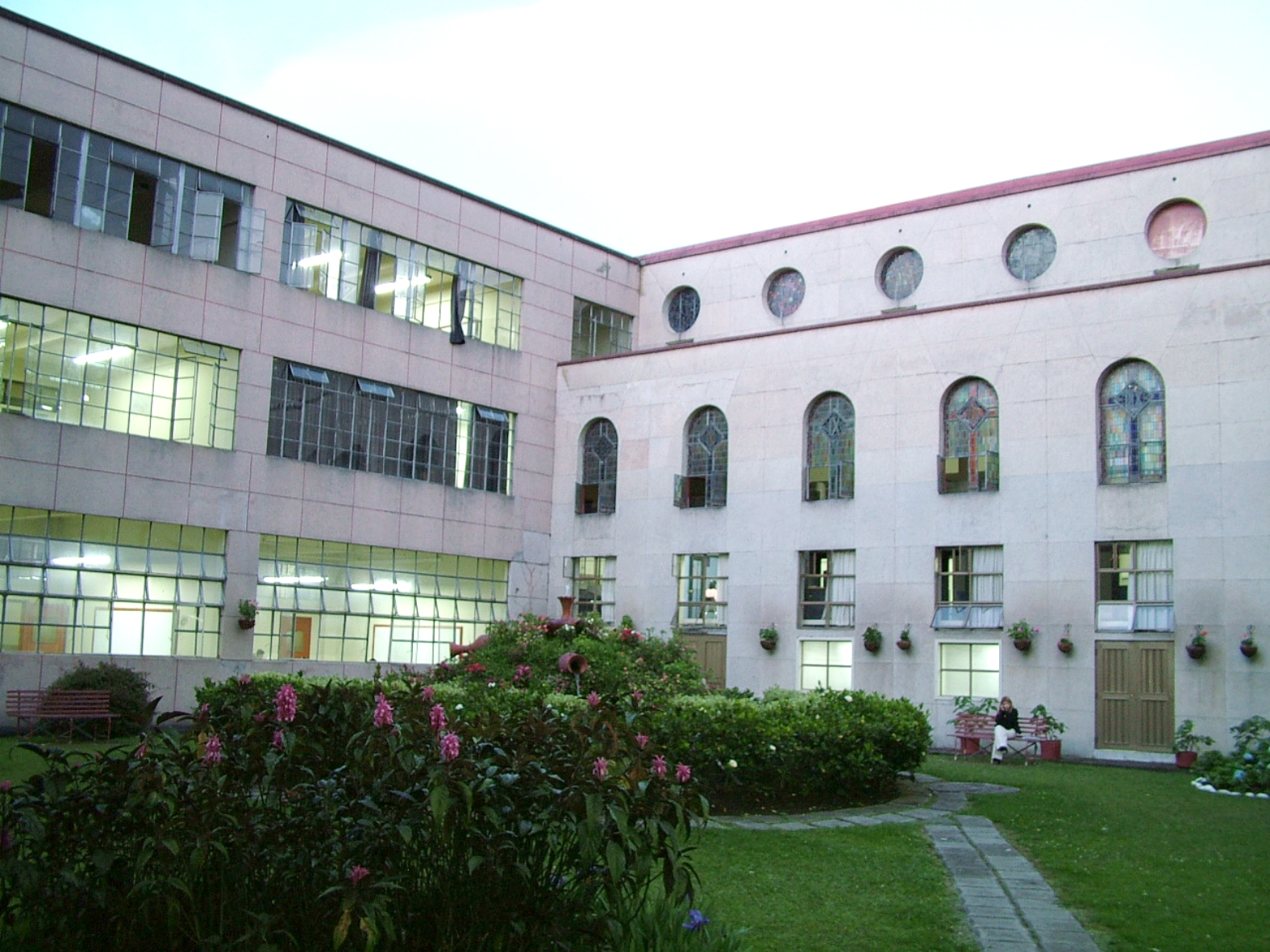 Esta imagen, tomada en 2004, muestra el jardín de lectura de la biblioteca. El espacio está rodeado por un edificio de arquitectura clásica. La fachada del edificio de la derecha presenta ventanas altas con vitrales de colores, que se corresponde con la capilla de la universidad. En contraste, el ala izquierda del edificio tiene ventanas rectangulares grandes con estructura metálica, que permiten visualizar algunas aulas o salas de estudio.