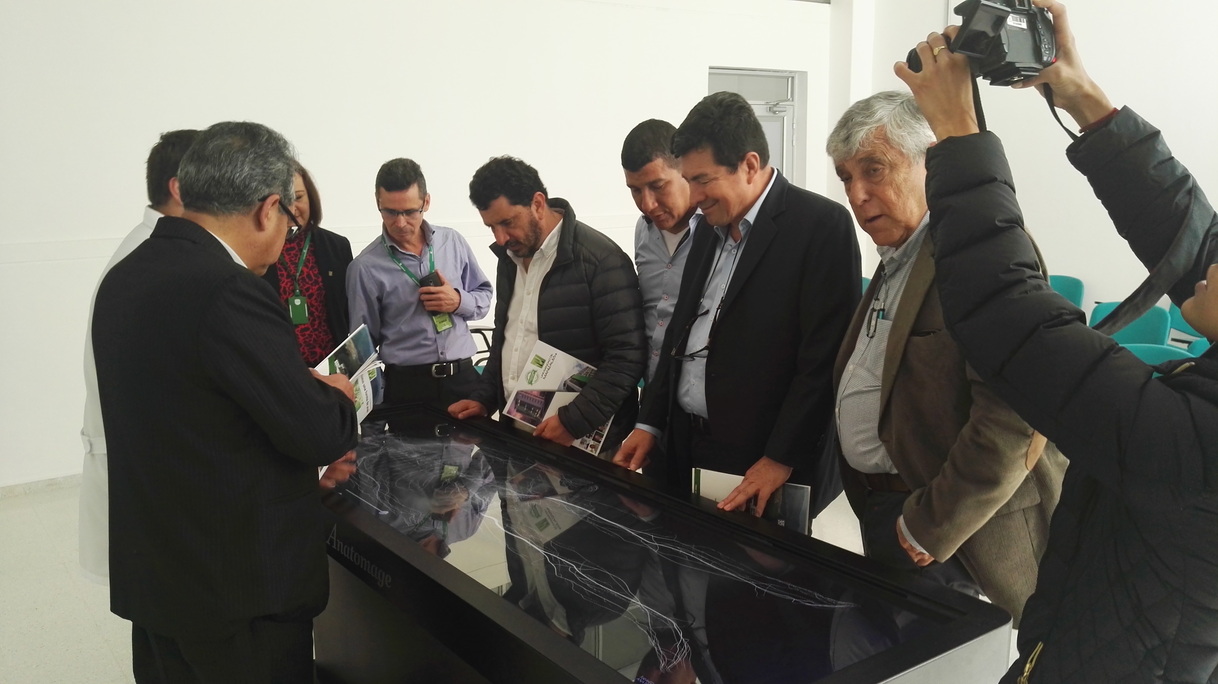 En la foto se observa a un grupo de personas participando en una presentación del recurso Anatomage, una mesa digital interactiva utilizada con fines educativos en anatomía humana. El grupo, compuesto por profesionales y académicos, presta atención al contenido que se muestra en la pantalla táctil de la mesa, la cual proyecta imágenes detalladas del cuerpo humano, lo que sugiere que se trata de una visita institucional o una jornada académica. Un camarógrafo documenta el evento, indicando la relevancia de la presentación.