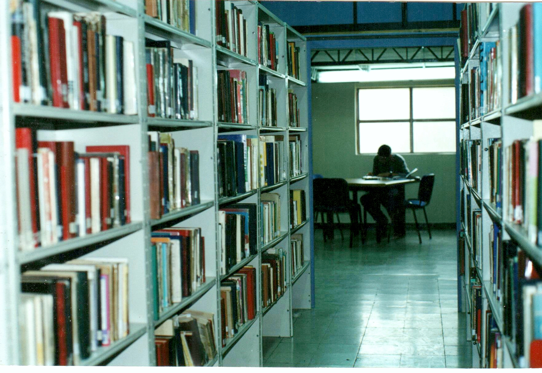 Esta fotografía, tomada en el año 2002 muestra a la biblioteca como ese espacio preferido por los estudiantes de la universidad, para el estudio y la concentración, desde aquel entonces. Puede apreciarse, además, un pasillo delimitado por dos estanterías de libros.