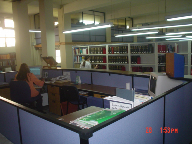La fotografía muestra una oficina o área administrativa ubicada dentro de la biblioteca y de atención al público. En el fondo, se aprecian las estanterías de libros. Un usuario, parece estar consultando o buscando información en las estanterías. El entorno sugiere un ambiente silencioso dedicado a la investigación.
