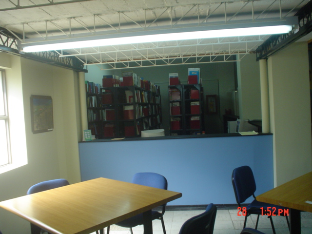 Área de lectura y hemeroteca de la biblioteca, con mesas, sillas y estanterías donde se prestaba el servicio de consulta y préstamo de las revistas académicas de la institución.